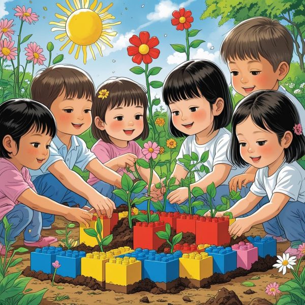 トマト、きゅうり、なすなどの夏野菜が大きく育つ過程を積み木で表現します。友達と協力して菜園を作り、野菜の成長に必要な水やりや太陽の大切さについて話し合い、自然の恵みに感謝する気持ちと、環境を大切にすることで美味しい野菜が育つことを学びます。